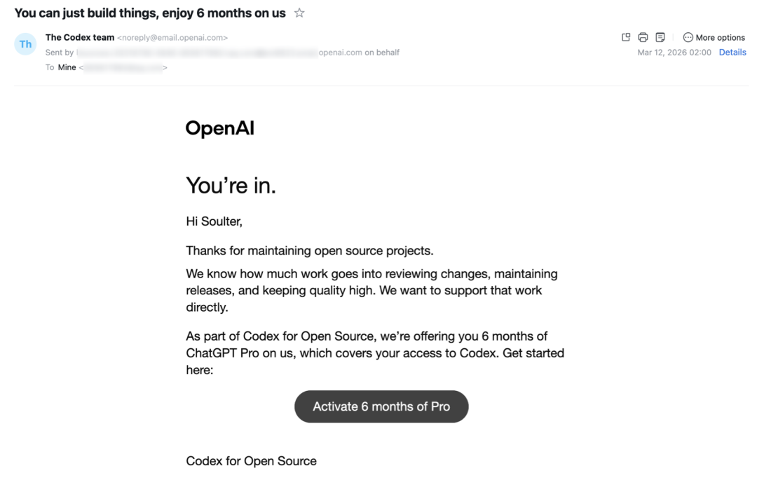 Soulter 也在 3 月 13 日的 B 站动态里提到自己收到了 OpenAI 的开源项目赞助。