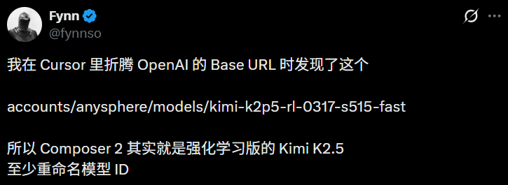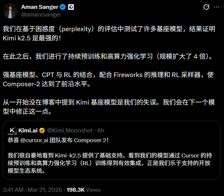 翻译过来就是,这个光环满满的Composer 2,底下跑的其实是Kimi K2.5的强化学习版本!