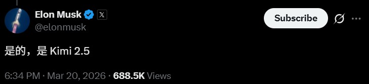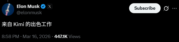 看热闹不嫌事大的马斯克立马下场,在评论区留了一句话:「Yeah, it's Kimi 2.5」。
