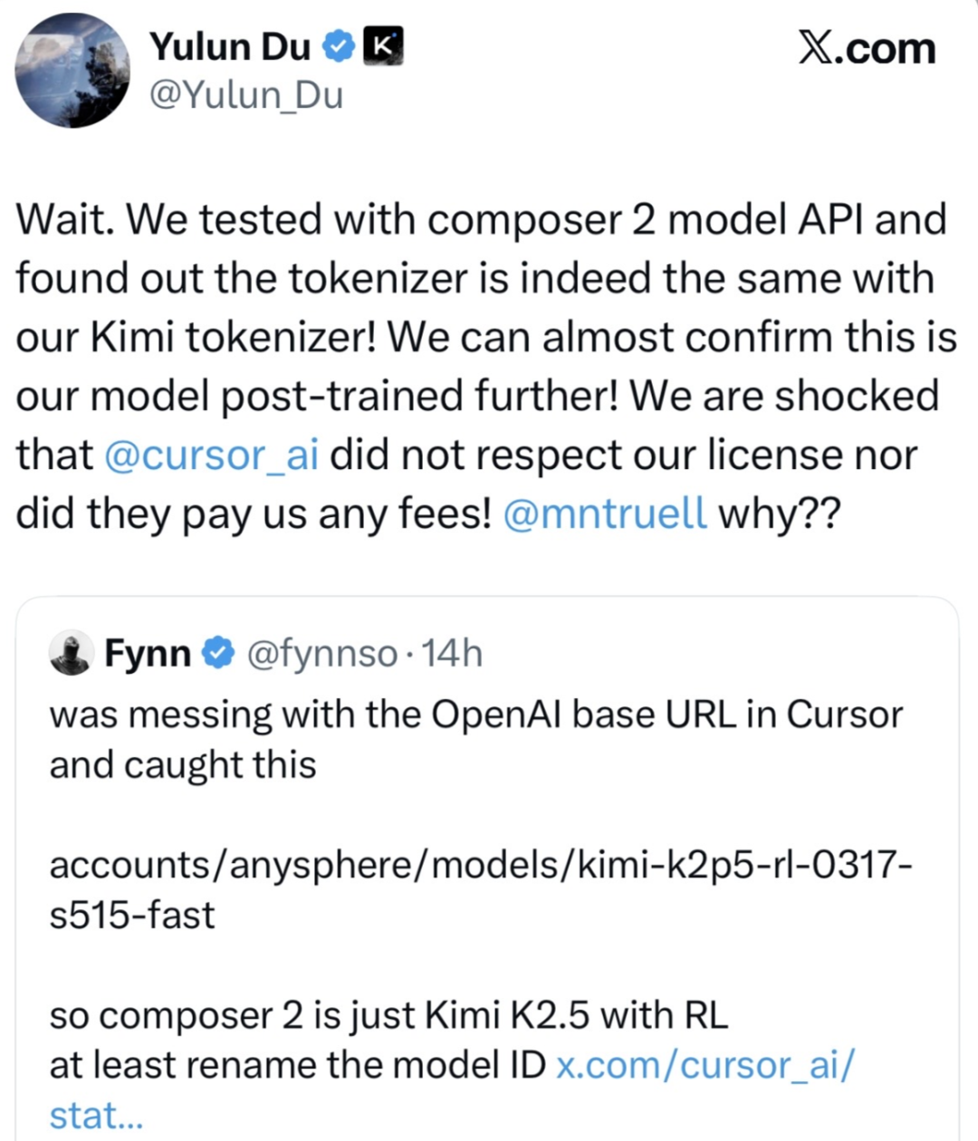 随后,Kimi的预训练负责人立即发推表示,我们测试了Composer 2的分词器,发现它跟Kimi的完全一致!