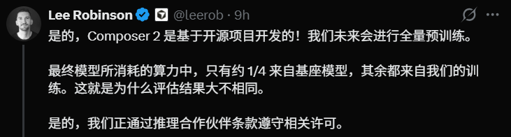 最初,他只承认是基于开源项目,并且甩出一组数据称,最终模型的算力消耗中,只有约1/4来自基座模型,剩下3/4全是Cursor自己的训练。