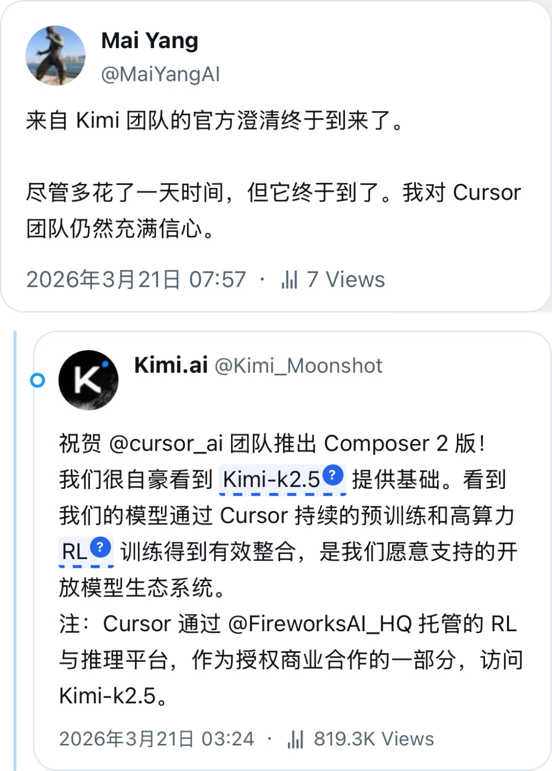 最终,Kimi也非常大度地下场和解,表示非常自豪看到K2.5为Composer 2提供基座。