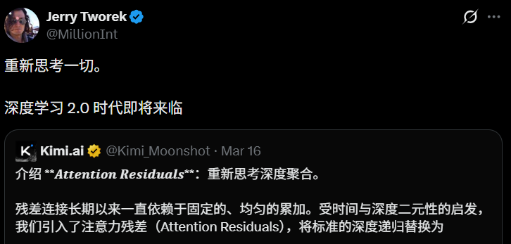 3月16日,Kimi团队在arXiv发布了一篇名为「Attention Residuals」的架构论文,马斯克转发并评价「Impressive work」。