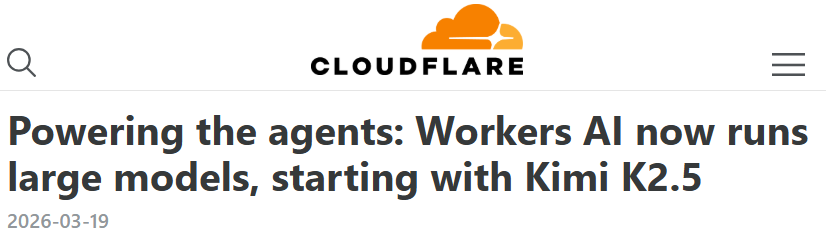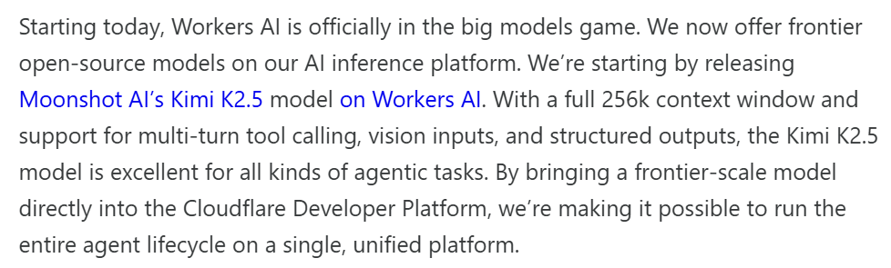 与此同时,全球最大的CDN服务商Cloudflare也在同一周宣布,将Kimi K2.5作为Workers AI平台上线的首个开源模型。