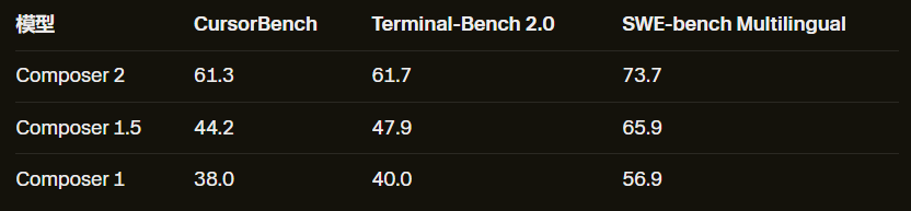 CursorBench上,Composer 2得分61.3,对比上一代Composer 1.5的44.2,提升近40%!