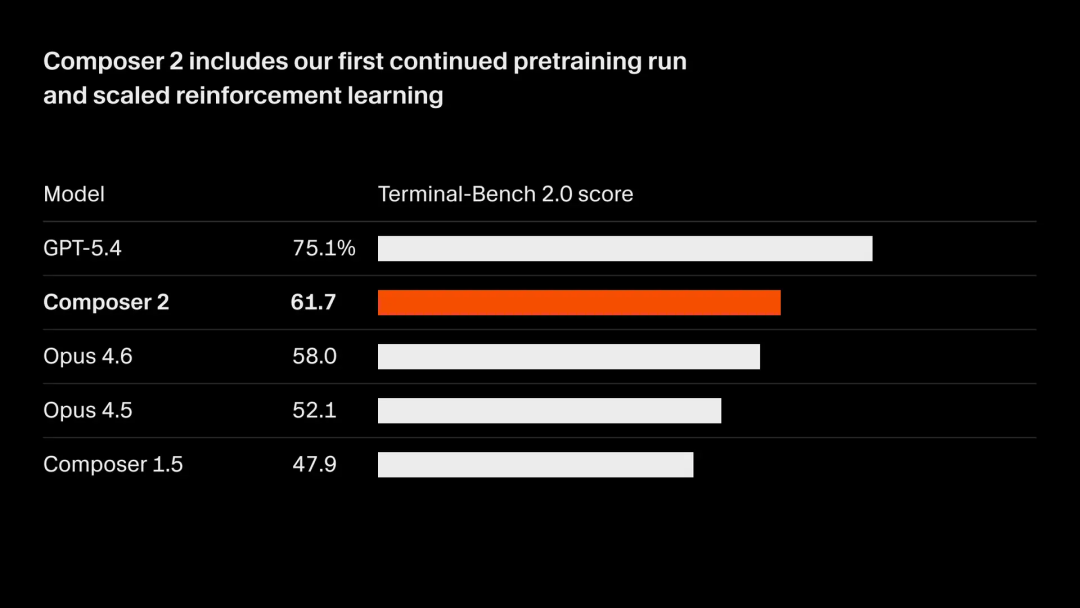 在测试AI在命令行环境中定位bug、编写修复、验证结果等全链路能力的Terminal-Bench 2.0上,Composer 2同样拿到了61.7的高分,一举超过Claude Opus 4.6的58.0和Opus 4.5的52.1。