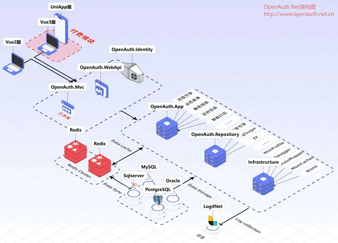 OpenAuth.Net 是一个基于 .NET 开源免费(Apache-2.0 License)的权限管理及快速开发框架,.NET 开源最好用的权限工作流系统。它源于 Martin Fowler 的企业级应用开发思想,并结合了最新的技术组合,如 SqlSugar、EF、Quartz、AutoFac、WebAPI、Swagger、Mock、NUnit、Vue2/3、Element-ui/plus、IdentityServer 等。该项目架构易于扩展,文档齐全且免费,特别适合中小企业使用。