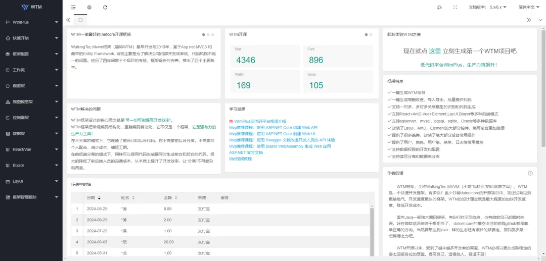 WalkingTec.Mvvm框架(简称WTM)是基于.net core的快速开发框架。支持Layui(前后端不分离), React(前后端分离),VUE(前后端分离),内置代码生成器,最大程度的提高开发效率,是一款高效开发的利器。