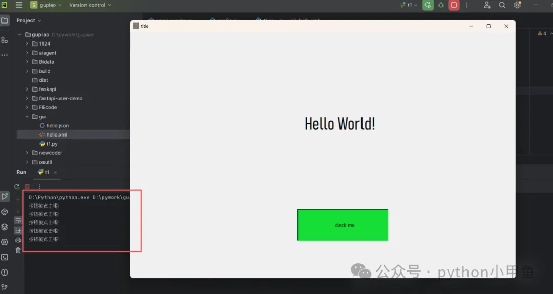 运行代码,你设计的GUI界面就会弹出来,点击按钮还能看到控制台输出——全程没写一行界面布局代码!