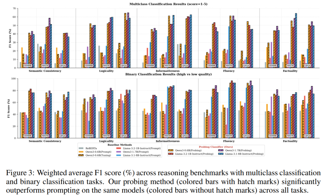 不管是 Qwen3 0.6B/1.7B,还是 Llama 1B/8B,探针方式都大幅超越提示式评估。