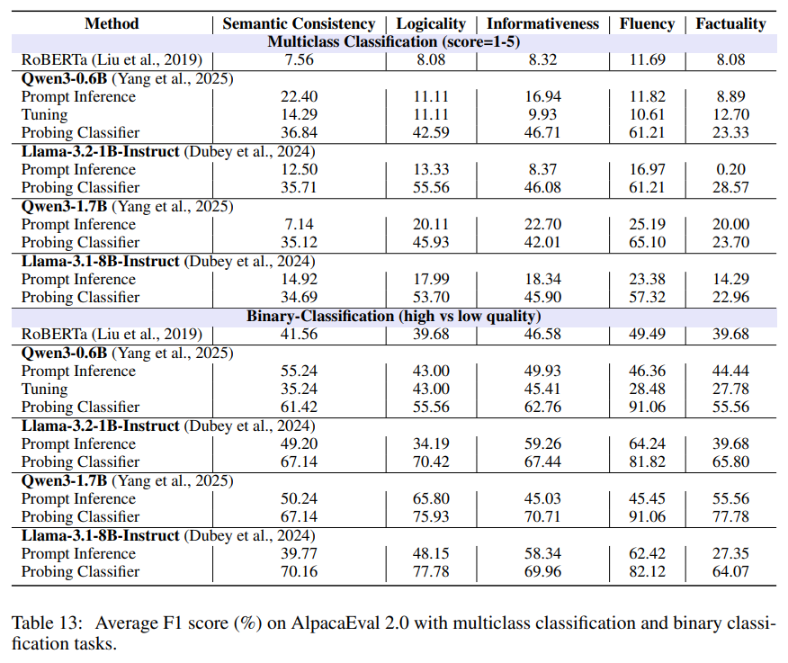 但是该研究在实验验证上仍存在一定欠缺,尤其缺乏对 Representation-as-a-Judge 范式输出分数可靠性的细粒度分析。例如,探针模型在高分段样本与低分段样本上的预测准确性并未分别验证,无法明确其在高置信度样本上是否稳定可靠、在低质量样本上是否存在误判;同时也未对预测分数的排序一致性、分数误差分布等进行深入分析,难以全面衡量探针输出的评分是否真正具备与 LLM-as-a-Judge 一致的判别能力。这些内容的缺失使得探针打分的可信度与实用性未能得到充分支撑。
