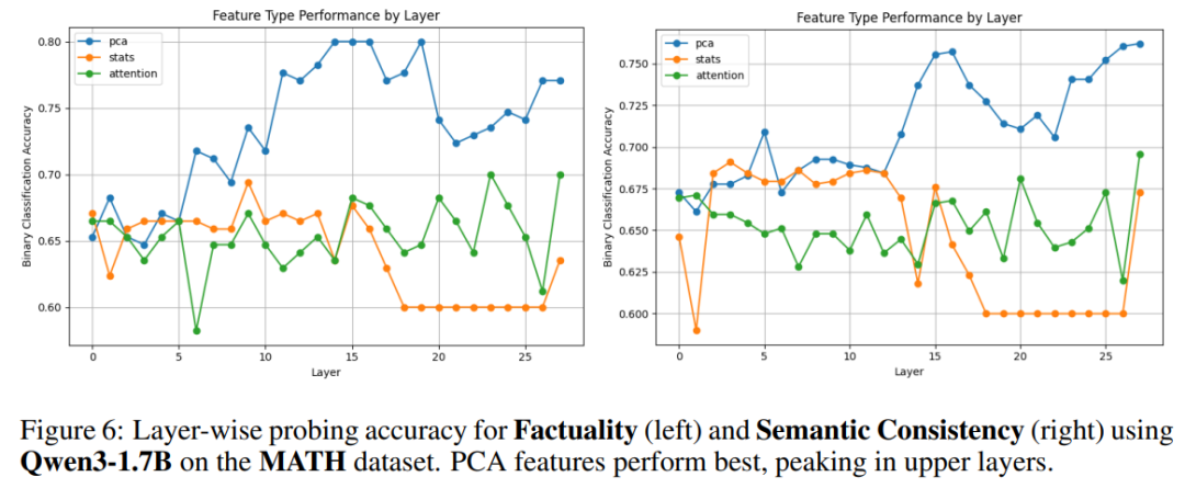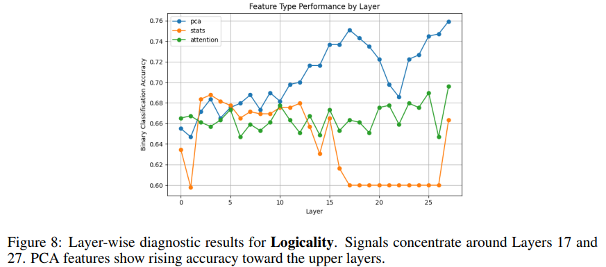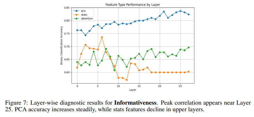 - PCA 特征 >> 统计特征 + 注意力特征直接证明:小模型中间层就包含强评估信号,不需要等到输出层。