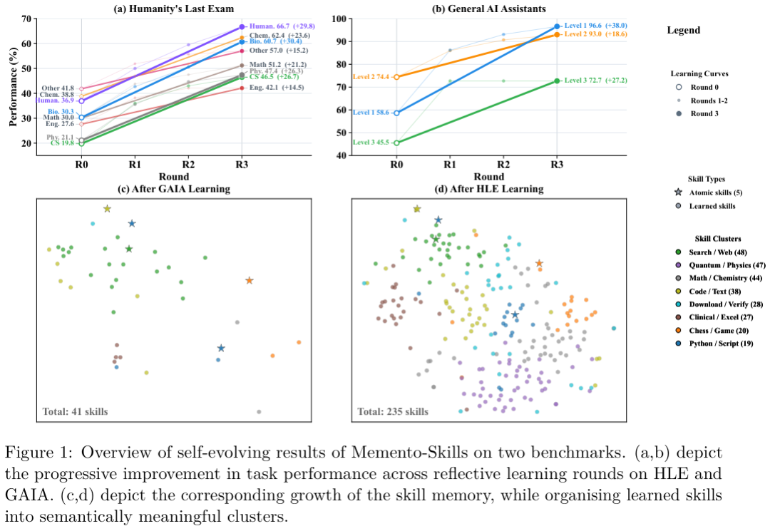 冻结语言模型的底层参数,让智能体通过不断改写外部的技能库来实现自我进化,系统准确率轻松实现翻倍跨越。