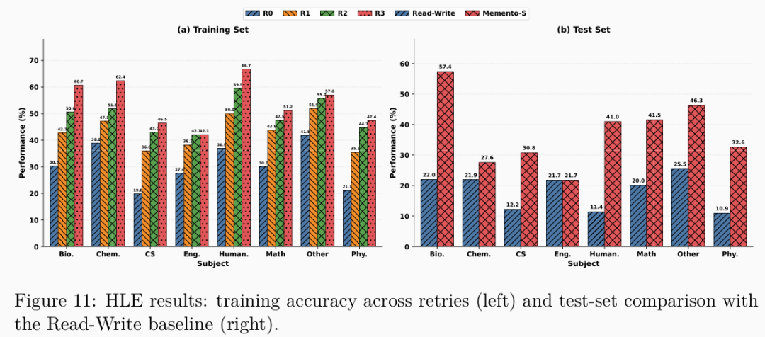 面对完全未知的测试数据集,全功能闭环系统交出了66.0%的准确率答卷,把取消了技能优化机制的只读写对照组远远甩在身后。