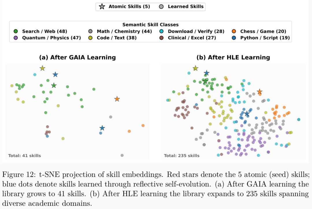 系统最初仅仅拥有5个类似网络搜索的基础原子技能。经过基准测试的千锤百炼,通用人工智能助手的知识库紧凑地扩展到了41个技能,人类终极考试的知识库如同宇宙大爆炸般繁衍出235个技能模块。