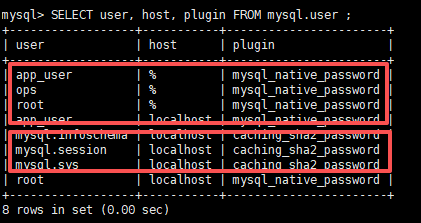 SELECT user, host, plugin FROM mysql.user ;- 1.