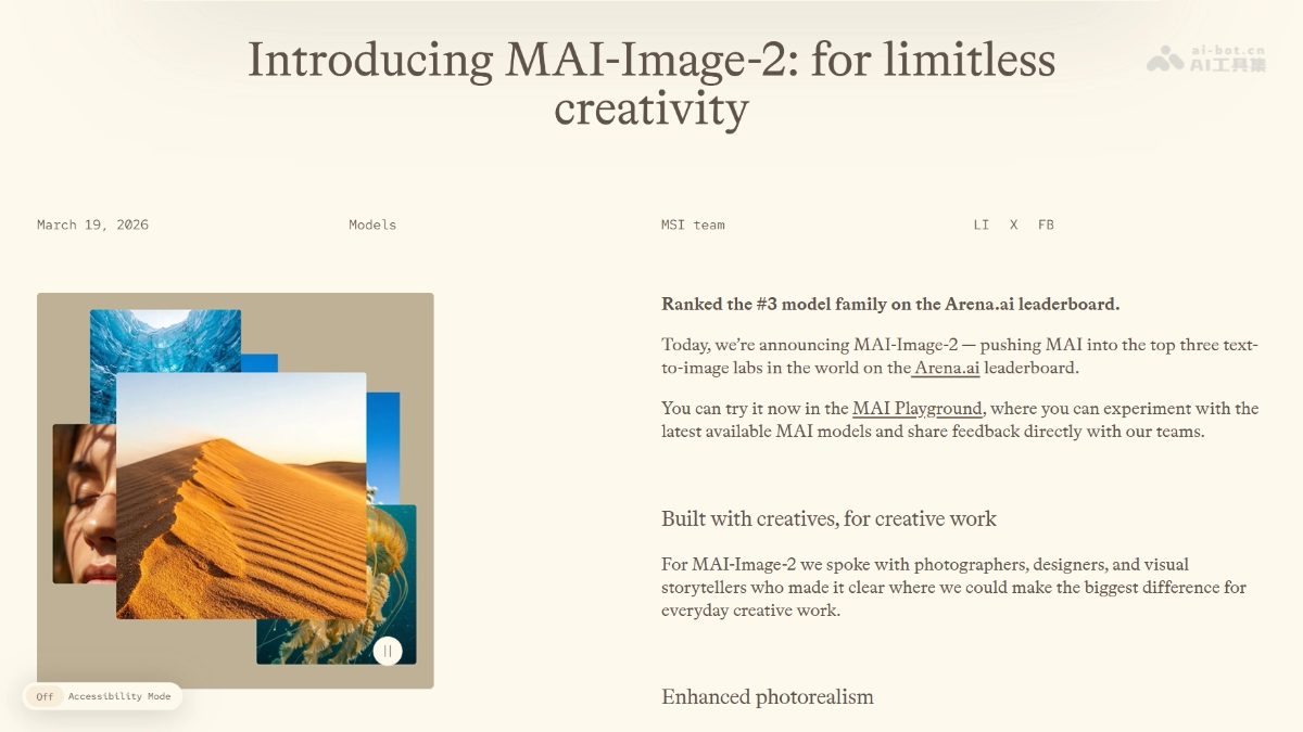 作为微软AI团队推出的第二代文生图模型,MAI-Image-2凭借卓越的图像生成能力在业界崭露头角。这款全球排名前三的AI工具,正在为创意工作者带来革命性的视觉创作体验。