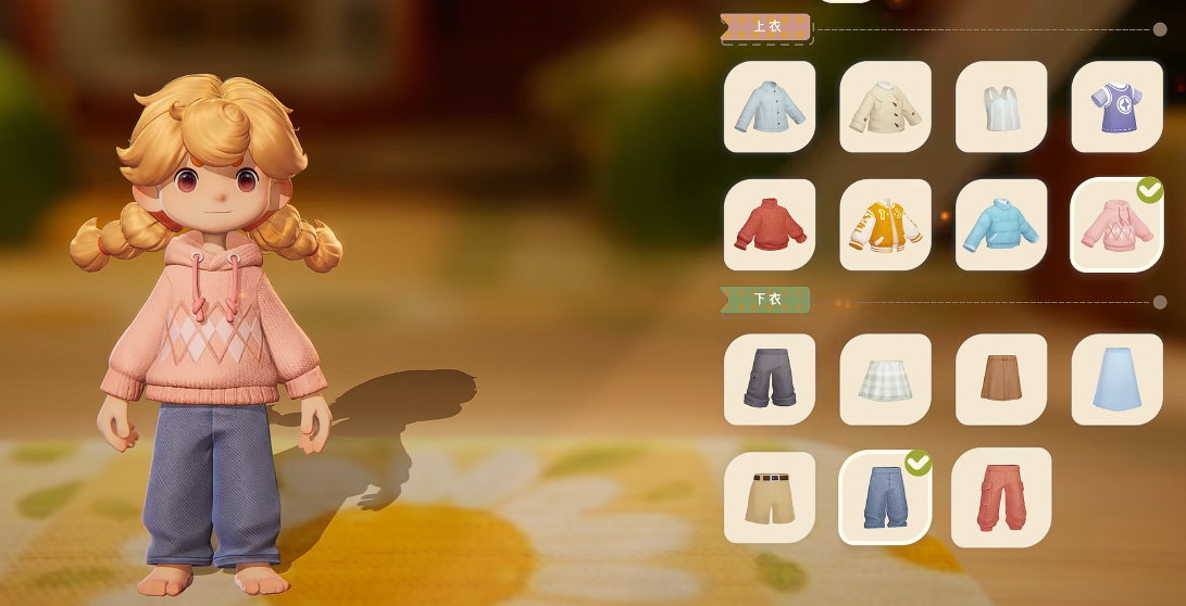 完成面部装饰以后,就是对服装进行搭配了,在新手阶段的衣服并不多,基本上衣服加上裤子的组合总共有8套的样子,并且衣服都属于基础款式,适合平时悠闲的时候穿,玩家们可以根据自己的审美进行搭配,一般只要颜色不冲突,搭配的形态都是比较好看的,后续可以通过任务以及活动来获取额外的服装哦。