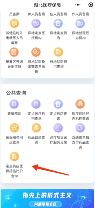 3. 页面下滑找到定点药店医保药品比价查询功能;