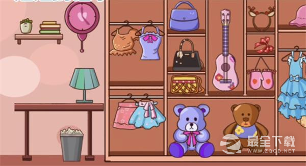 4、最后将两个玩具熊放在衣柜下面,再把房间里的垃圾扔到垃圾桶,然后就能通关啦。