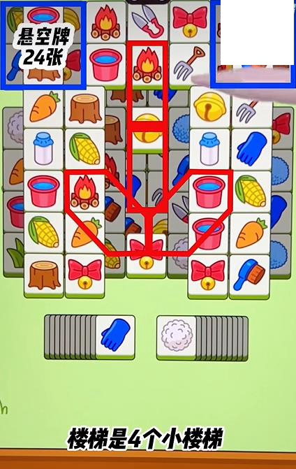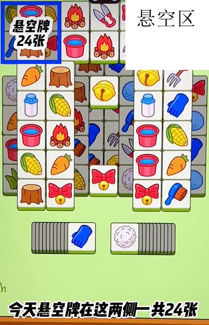 1、今日的挑战关卡中悬空区在左上右上方,总共24张牌。
