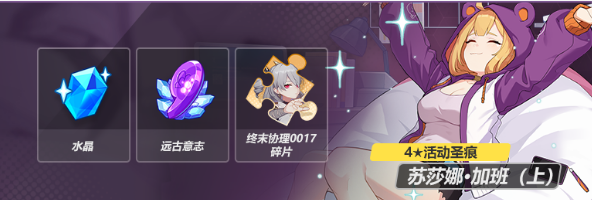 舰长参与6.6版本主线各类玩法可获得「盐雪结晶」,当积攒「盐雪结晶」达到一定数量后,舰长即可前往奖励界面领取积分对应的4★活动圣痕「苏莎娜·加班(上)」、水晶、远古意志等奖励。部分奖励为限时奖励,仅可在主线大篇章活动期间获取,请舰长注意活动时间~