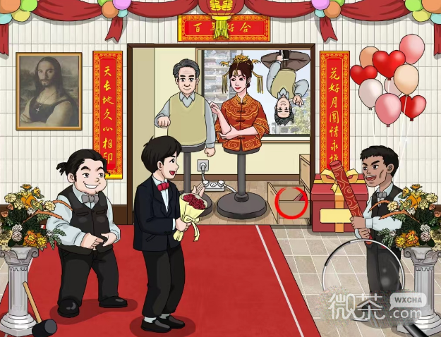 1、进击的汉字百年好合需要帮助新郎搞定岳父大人,首先将放大镜拖到新郎身上,找到房产证、卡和爱你的心,点击花上的卡片触发现场表白