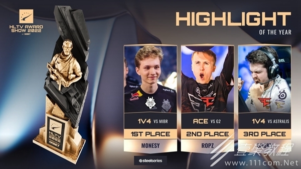 HLTV在2022年颁奖典礼上公布了最佳年度高光的获奖名单,m0NESY对阵MIBR时的1v4力压ropz和broky获得了年度最佳高光时刻。