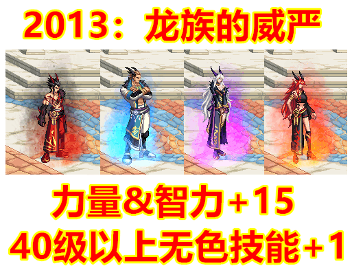 吸取了去年被玩家吐槽的教训,13年的国庆套光环属性稍作了改动,在40级以上无色技能+1的基础上加入了力量&智力+15的设定。虽说15点力智带来的提升聊胜于无,但这是一个好的开端,起码比去年加强了。
