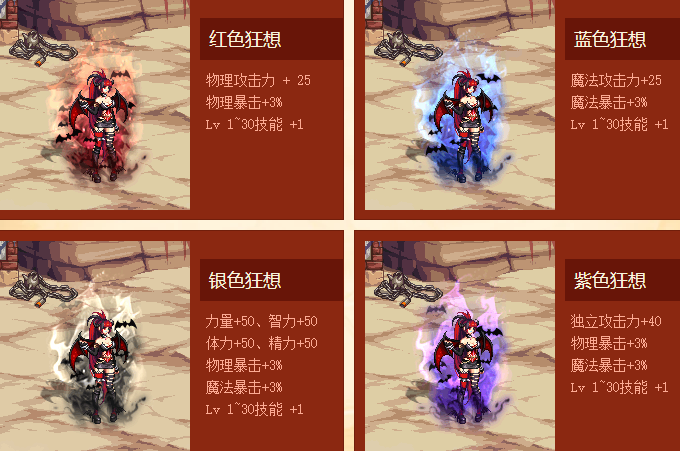 2014年狂想系列称号发生了质的飞跃,狂想系列光环有四种颜色可选,每种颜色对应的属性都不同,红色是物攻、蓝色是魔攻、紫色是独立、银色是四维,共有属性是Lv1~30技能+1和双暴+2%。如果说12年国庆套为往后加入光环奠定基础,那么14年光环属性则为往后光环的属性奠定了基础。