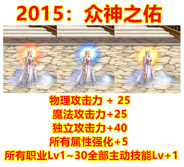 2015年众神之佑光环再次发生质的飞跃,统合了去年光环物攻、魔攻和独立的属性到一个光环中去,并且出现了所有属强的属性。最最最中要的一点是加入了光环可镶嵌两个徽章的设定,除白金徽章外可以镶嵌所有颜色的徽章,最高可以带来四维+50点的提升,往后每年的光环都加入了镶嵌两个彩色徽章的设定。