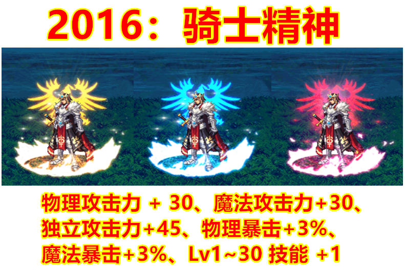 2016年光环的属性和15年的相差不大,在三攻方面整体提升了5点,所有属强+5变更为3%的双暴。但是有一点超越了去年的光环,那就是Lv1~30技能+1的设定加入了适用于被动技能。