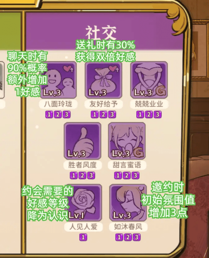 天赋技能有四项关联送礼/邀约的好感,请根据自己分配提升好感值。
