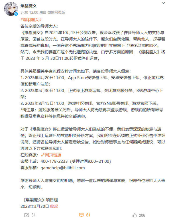 1:首先爆裂魔女停运是真的,在微博中爆裂魔女官网也发布了声明了,具体的停运时间是在2023年5月30日停运;