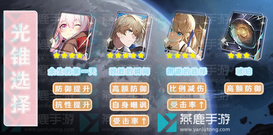 【琥珀】:过渡性光锥。精5,防御力提高32%。当生命值低于一半,防御力会再次提高32%。