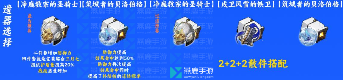 【圣骑士4】+【贝洛伯格2】:圣骑士套可以增加防御力,4件套提供的护盾量提高20%,战技盾量增加,完美契合三月七。而贝洛伯格套则能够提高防御力,效果命中达到50%则防御力再次提高。同时效果命中还提高了终结技的冻结概率。