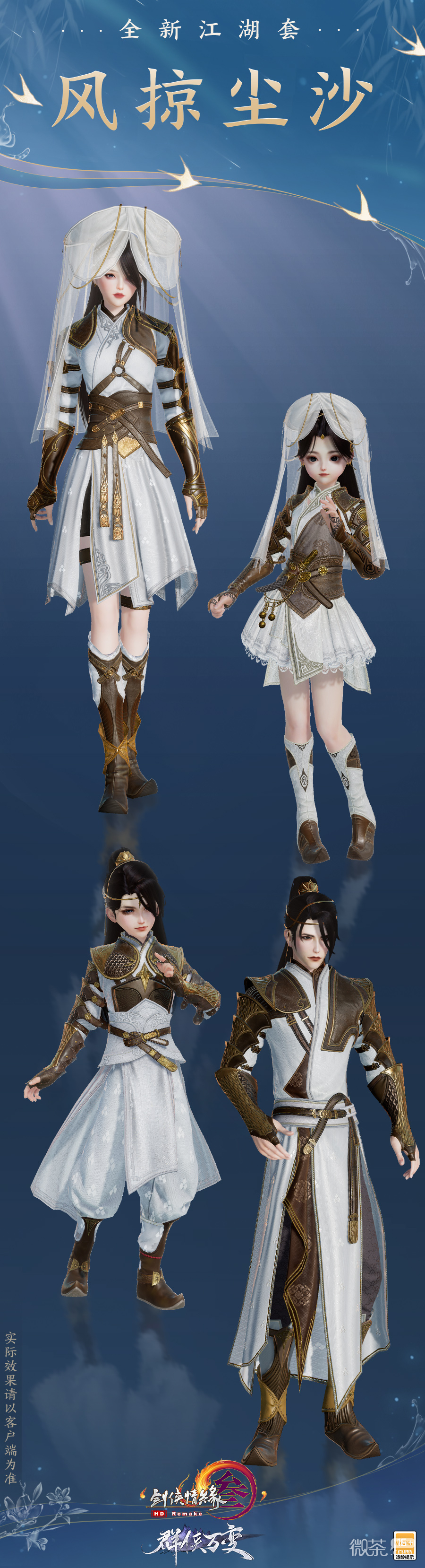 欲问前路知如何,大漠尘沙盖天穹。全新江湖套装“风掠尘沙”轻装上阵,全套以烫金革甲与月白绸缎相衬,一派简装承载侠士豪情。鎏金束带恰适腰间,干练利索,女款附带遮面风纱,平添一份行走江湖之神秘。男款甲胄藏锋,更显英士风姿。