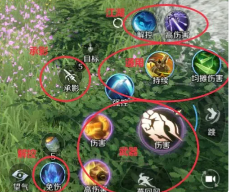 技能构成分为五个大部分:武器技能、通用技能、江湖技能、解控技能和承影。