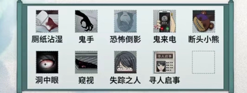 答案: 厕纸沾湿、鬼手、恐怖倒影 、鬼来电、断头小熊 、洞中眼、窥视、失踪之人、寻人启事