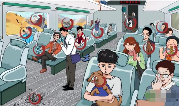 1、汉字找茬王高铁之旅找出12个不文明行为是:乱扔垃圾、霸占座位、脱鞋抠脚、带宠物上车、脚搭前座、音乐外放、踩在凳子上、皮套擦鞋、吃螺蛳粉、抽烟、拿走纸巾、挂票。
