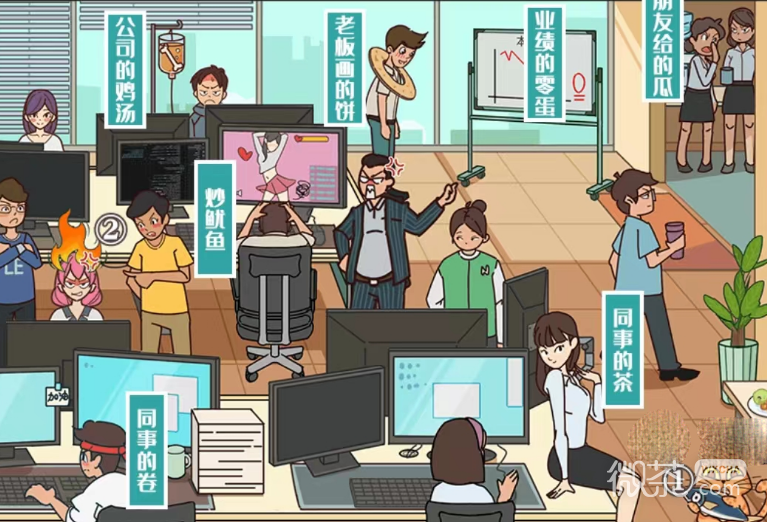1、图文世界寻找职场美食,首先拖动老板到偷偷看美女的员工处可以获得“炒鱿鱼”