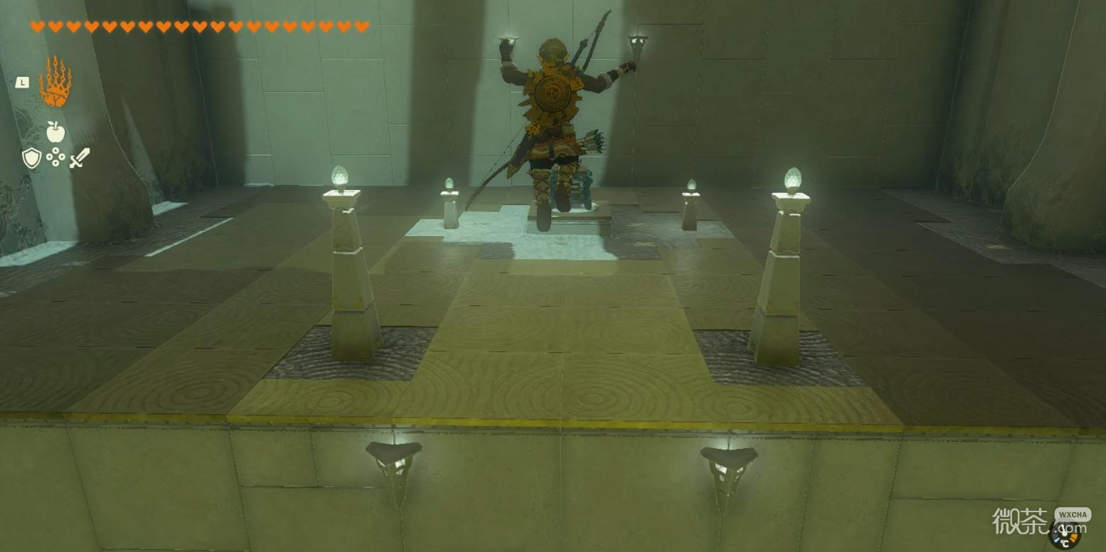 进入神庙后先通过前方的机关弹至空中,滑翔抵达上层。
