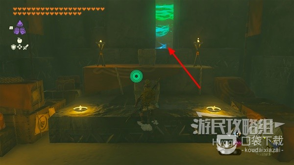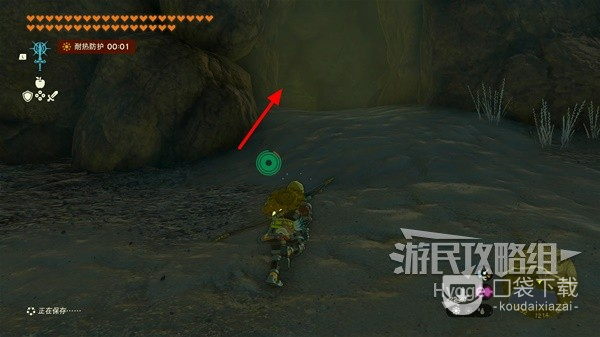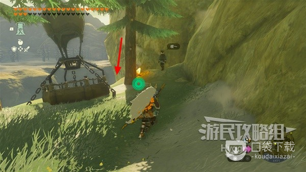 使用附带火焰果等物品的箭矢即可点燃在右手边的第一处篝火,随后通过篝火旁边的瀑布再次向上。