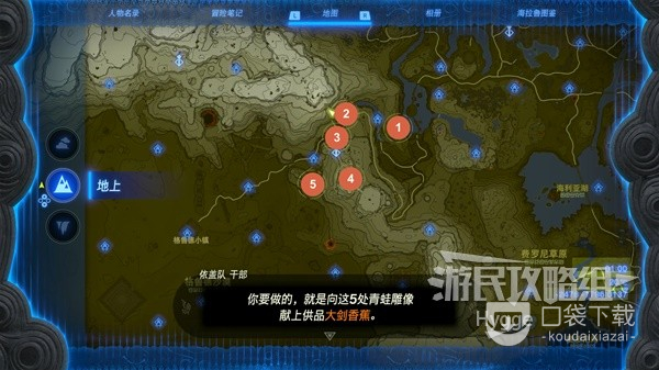 与房间中的伊盖队干部交谈开启考核,我们需要为散布在各处的五个青蛙雕像供奉大剑香蕉,雕像的位置会在地图上标记出来。