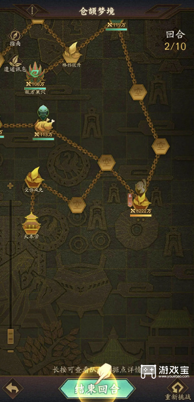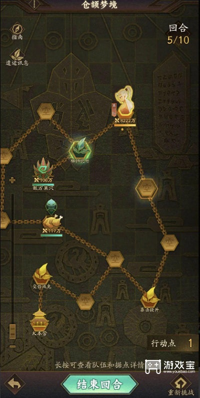1、第一回合:沿着锁链向前进,领取“梦境遗迹”中的buff,助力更快通关,击败敌人后点击“结束回合”进入敌方轮次;