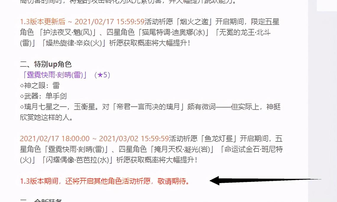 米游社官方的公告想必大家都知道了,其中有一条消息耐人寻味。“1.3版本期间,还将开启其他角色活动祈愿,敬请期待”。