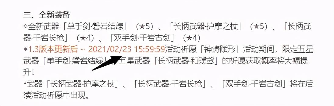 武器池子竟然不和角色池子一起开放但是却不是一起关闭,这就真的耐人寻味。也就是说很明显,这个版本三个角色up池,但是只有两个武器up池子。按照官方说法一个版本6周42天(之前版本是两个角色池,每个池子21天。现在是三个角色池每个14天),这第一个武器池子刚好就21天。而在后面的武器池子同样也是21天,也就是护摩up的时候,后阶段是完全能对应上胡桃的14天角色up池子。