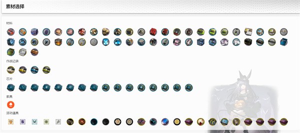 3、当然也是可以按照素材来选择的,已经将明日方舟中的全部道具收集了,并且按照材料、作战记录、芯片、家具和活动道具来分类的。
