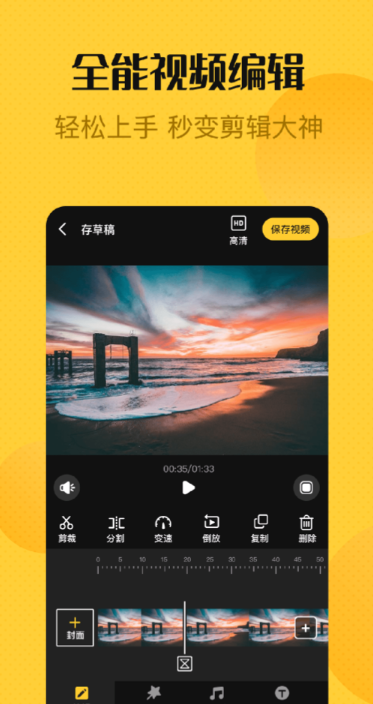 这个软件里面的小工具还是非常多的,比如最简单的事,我们可以对视频进行裁剪,也可以进行专门的配乐。如果我们想直接通过这个APP录制视频的话,也是完全可以的,而且后面的处理也支持很多种,比如我们对视频进行翻页处理完成之后,都会在我们的剪辑库中显示出来,随时都可以导出。