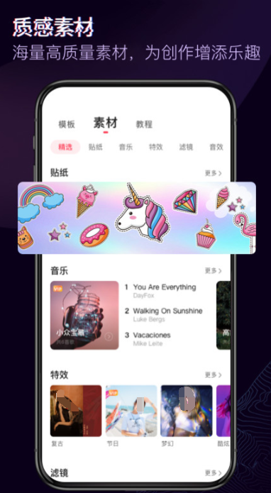 这款软件具有非常强大的视频效果和音频库,我们可以通过预设和调整实现视频特效的添加和音频的制作,还可以支持社交媒体和视频分享平台的输出设置,方便我们将作品更好的分享和宣传。此外,这款软件里面拥有一个非常强大的素材库在里面,我们可以寻找自己喜欢的贴纸,或者直接找到比较热门的音乐作为视频的背景,让我们的视频做出来更加美观。